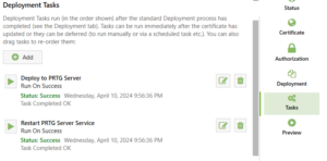 Now we have a certificate, we need to get it working with PRTG. There’s free tool available from Paessler to do it manually (here) but hey, half the point of doing all this is for things to work without needing to be poked every 90 days! This where the new CtW functionality becomes very useful. On the “Tasks” page of the certificate in CtW, add two tasks.